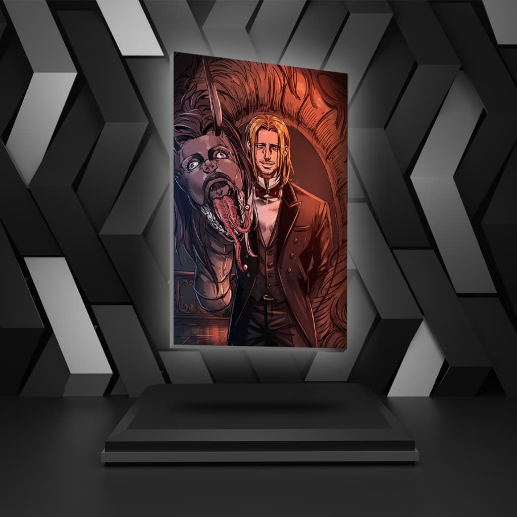 L'élégance sinistre de Tserriednich rencontre la monstruosité viscérale de sa bête de Nen dans une œuvre aux tons sombres qui fige la tension psychologique de la Guerre de Succession.