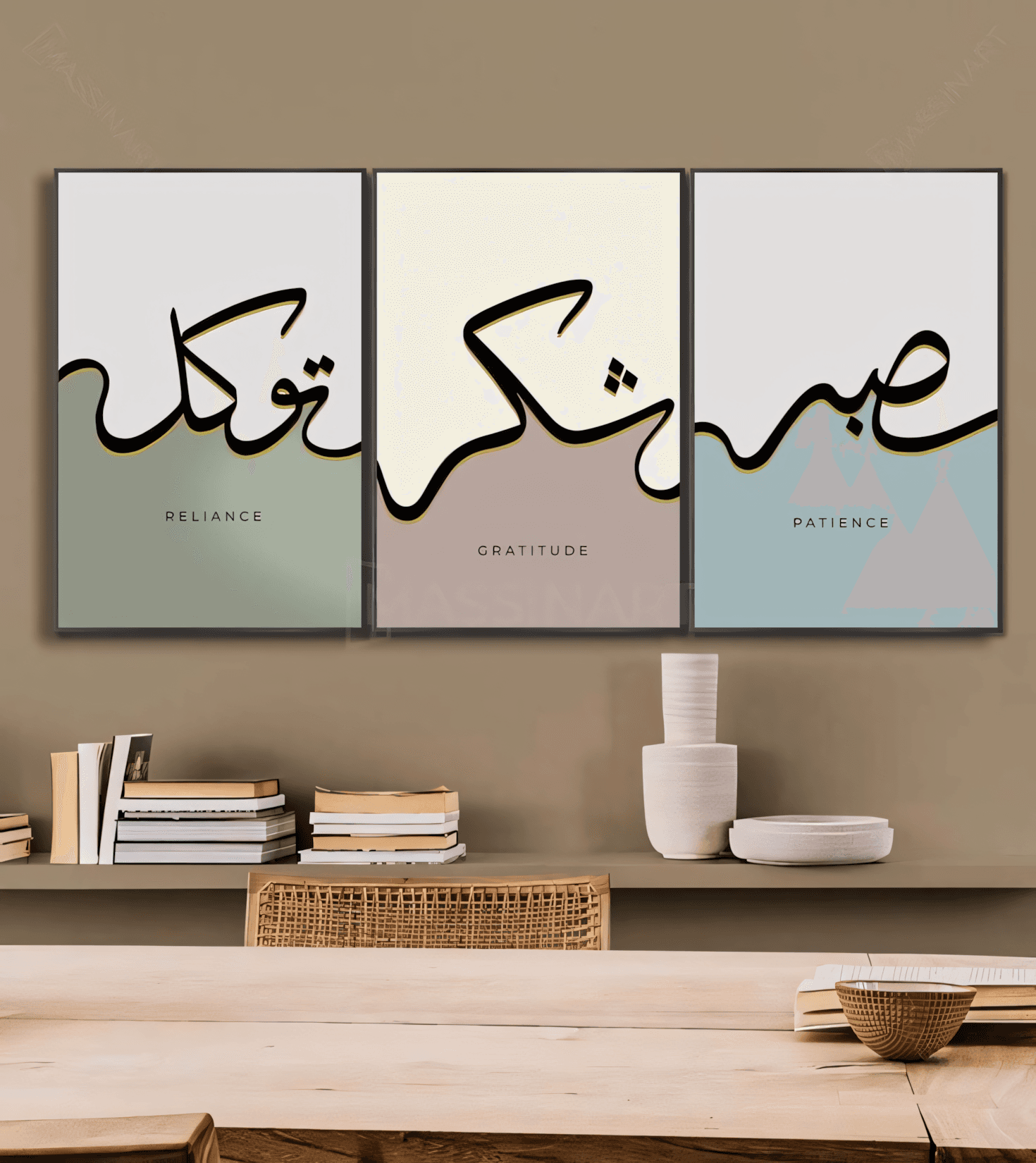 Un triptyque spirituel et organique où la calligraphie fluide de la patience, de la gratitude et de la confiance s'unit pour transformer votre intérieur en un havre de paix terracotta.